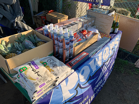 沖縄の長谷川様から、パイナッピー杯の景品にとパイナップルを送っていただき、佐藤氏の旧友からは写真付きのお酒を協賛していただきました。他にお米やカセットコンロなどもご用意いたしました。 |