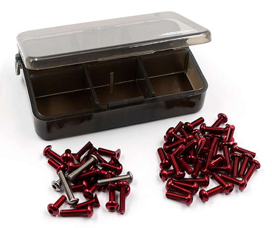 | ●セット内容(合計 64本) アルミボタンヘッド 3 x 8 (8個) アルミボタンヘッド 3 x 10 (38個) アルミボタンヘッド 3 x 12 (7個) アルミフラットヘッド 3 x 10 (7個) チタンボタンヘッド 3 x 15 (4個) ミニボックス(1個) |