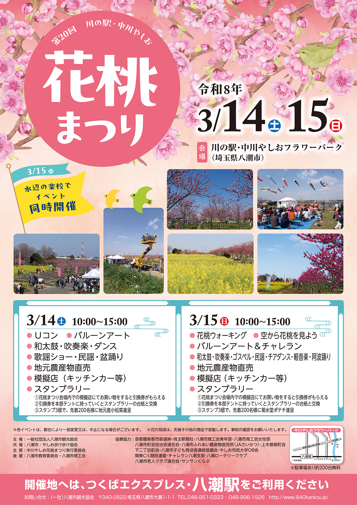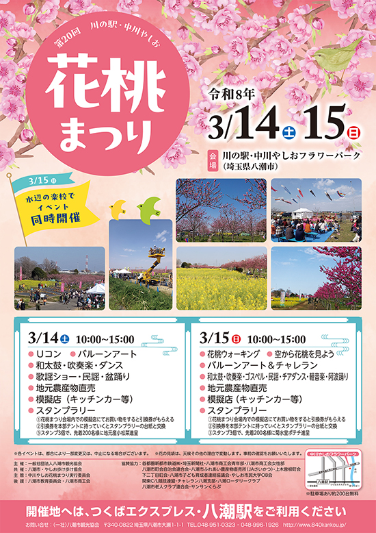 毎年恒例(昨年は中止)の《第20回やしお花桃まつり》が、開催されます。