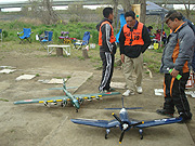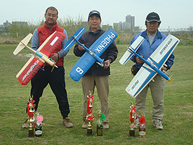 2012年4月22日(日)、神奈川県海老名市のCHAC専用飛行場におきまして、<南関東Jr(小型機)選手権2012>が開催されました。昨年春の小型機大会は震災の影響で開催中止となっておりましたので2年ぶり5回目の小型機大会となりました。 昼休みには、デモ飛行として 朝霞エアロパーク フライングクラブの石川さんによる富嶽(エンジン2基、モーター4基のハイブリット大型機)が披露されました。先日の全国Uコン初心者大会時のデモでは始動中にエンジンマウントが破損してしまうというトラブルがありましたが、今回は補修も行われ6基のプロペラ音をとどろかせながら迫力のフライトを披露して頂きました。また、茅ケ崎ホーカー飛行機クラブの馬場さんは新作コルセアを披露、ガルウイングが見事なスケール感をかもしだしておりました。ギャラリーは大型のスケール機の飛行に大いに盛り上がりました。 午後からは、2種の決勝戦が行われました。予選を勝ち抜いた5名の選手とも予選時よりも高得点をたたき出してきましたが、青いフェニックスできれいに演技をきめた田中義康選手が優勝を獲得いたしました。 |