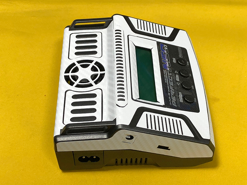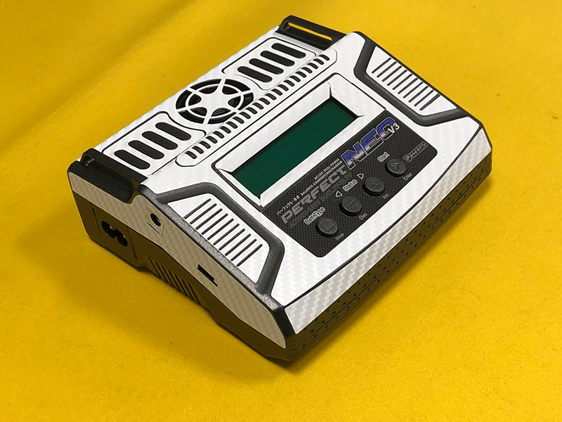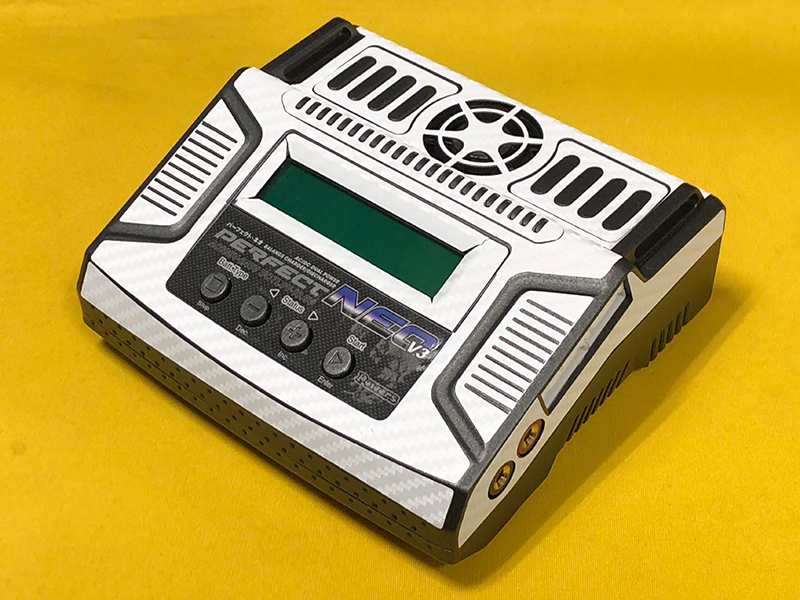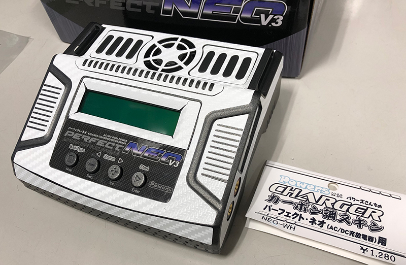 パーフェクトネオV3 + プライベートガレージ製カーボン調スキン(ホワイト) を貼付済でプレゼントします カーボン調スキンは、ホビーバンクにて特価販売中です。 新品の充電器にスキンシールを貼り付けました スキンシールは初代ネオ用として発売しておりましたが銘板部分以外は同じですので ネオV3にもジャストフィットします