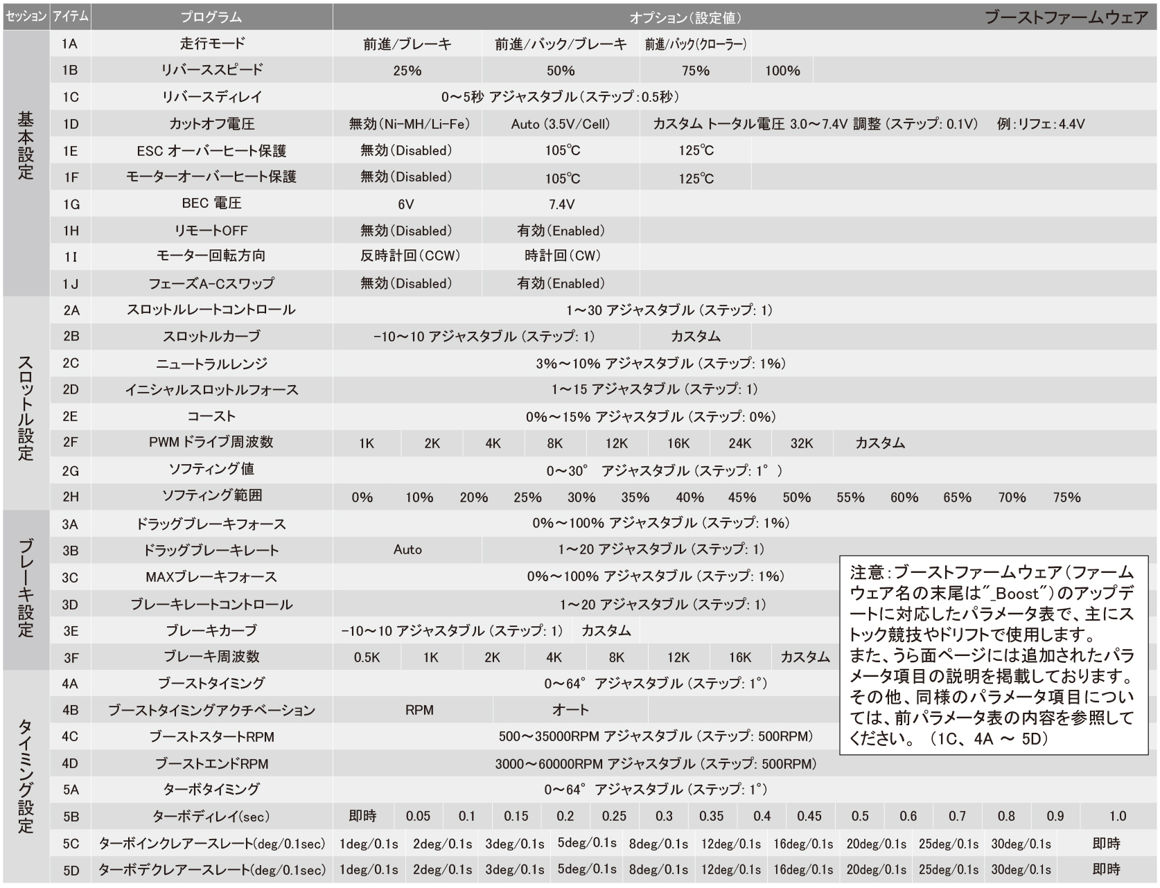 | 1つのファームウェアであらゆるレースコンディションに対応できるよう、3つの "選択しやすい "プリセットモードが用意されています。ユーザーは、コントロールフィーリングやコースなどに応じて用意されたモードの設定を変更することができます。 (ゼロ・タイミング・ファームウェア) ゼロタイミングクラス 1/10オンロードカー レーシング ゼロタイミングクラス 1/10オフロードカー2WD レーシング ゼロタイミングクラス 1/10オフロードカー4WD レーシング (ブースト・ファームウェア) ストッククラス 1/10オンロードカー レーシング ストッククラス 1/10オフロードカー レーシング 1/10 2WD ドリフト競技 |