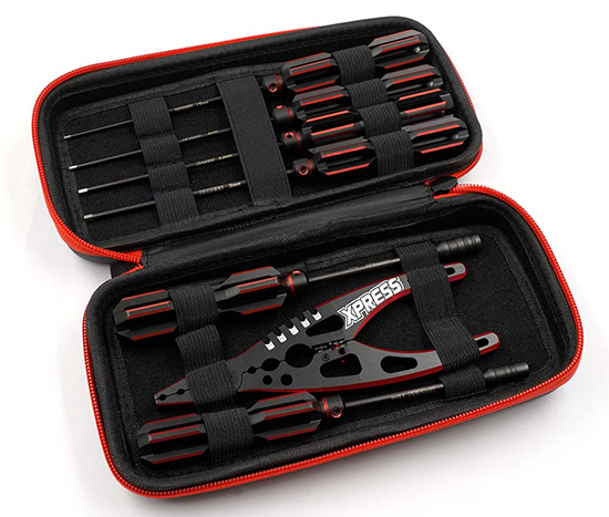 Xpressドライバーとショックリビルドツールのセットに、工具をしっかり保護するキャリングケースが付属! 車の整備に必要な工具がすべて揃った、まさに万能ツールセットです。 材質:7075アルミニウム、スプリングスチールツールチップ カラー:ブラック/レッド 1.5mmドライバー(1個) 2.0mmドライバー(1個) 2.5mmドライバー(1個) 3.5mmドライバー(1個) 5.5mmナットドライバー(1本) 7.0mmナットドライバー(1本) ショックリビルドツール(1個)